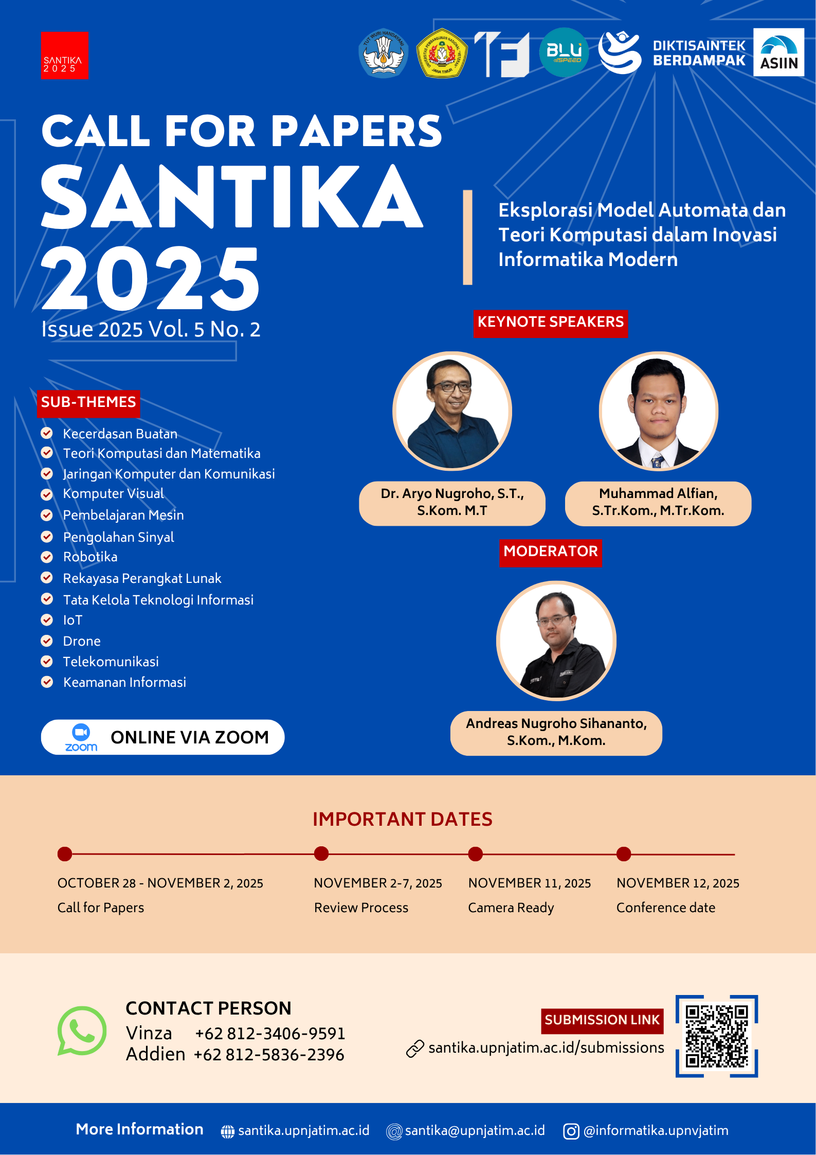 Seminar Nasional Informatika Bela Negara (SANTIKA) 2025 Vol. 5 No. 2 digelar untuk mempublikasikan hasil penelitian dari peneliti. Seminar ini melibatkan dosen, mahasiswa, peneliti, praktisi, maupun para pengamat Ilmu Komputer & Informatika. Santika 2025 memiliki tema “Eksplorasi Model Automata dan Teori Komputasi dalam Inovasi Informatika Modern”. Seminar SANTIKA digelar setiap tahun. Semua paper yang lolos seleksi akan diterbitkan di proceeding SANTIKA yang telah memiliki ISSN dan diindex Google Scholar. Selected Paper akan dipublikasikan ke Jurnal Sinta 4.